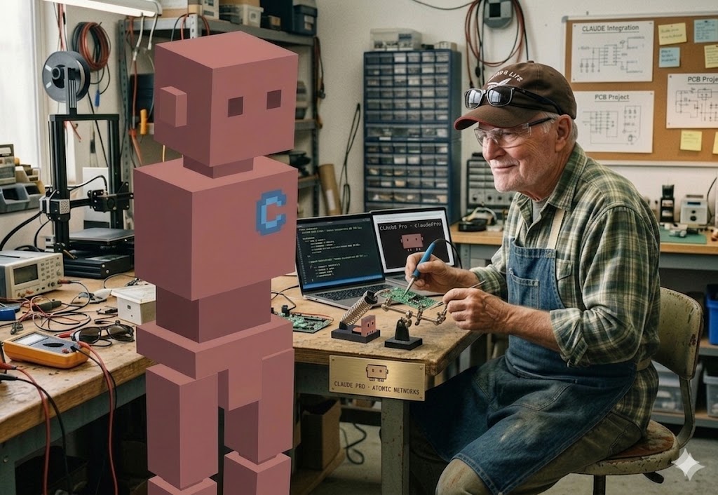 That image at the top of this post is what I imagine it looks like from the inside: an older guy at a workbench, soldering iron in hand, the Claude robot standing there, a PCB project on the corkboard. Figuring it out one session at a time. At 80. While most of his peers are trying to figure out their iPad settings. The only problem is that robot has no arms. That's Chat. Switch to Projects and you give it hands. Or better yet, use Cowork — that's Claude with direct access to your computer and your files. Which means it can actually do things, not just tell you how. Just make sure you know what you're doing before you hand it the keys.